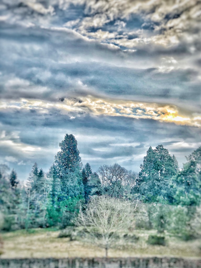As we talk, I do chores about the horses’ field that I’ve been putting off. I need to change their arrangements and tape off certain sections. I loathe this kind of job, but my friend is so interesting and funny that I rattle through the dreaded jobs without thinking. The wind is up, buffeting me about a bit. The telephone is on speaker, so I imagine terrible windy noises howling down the line to Herefordshire.